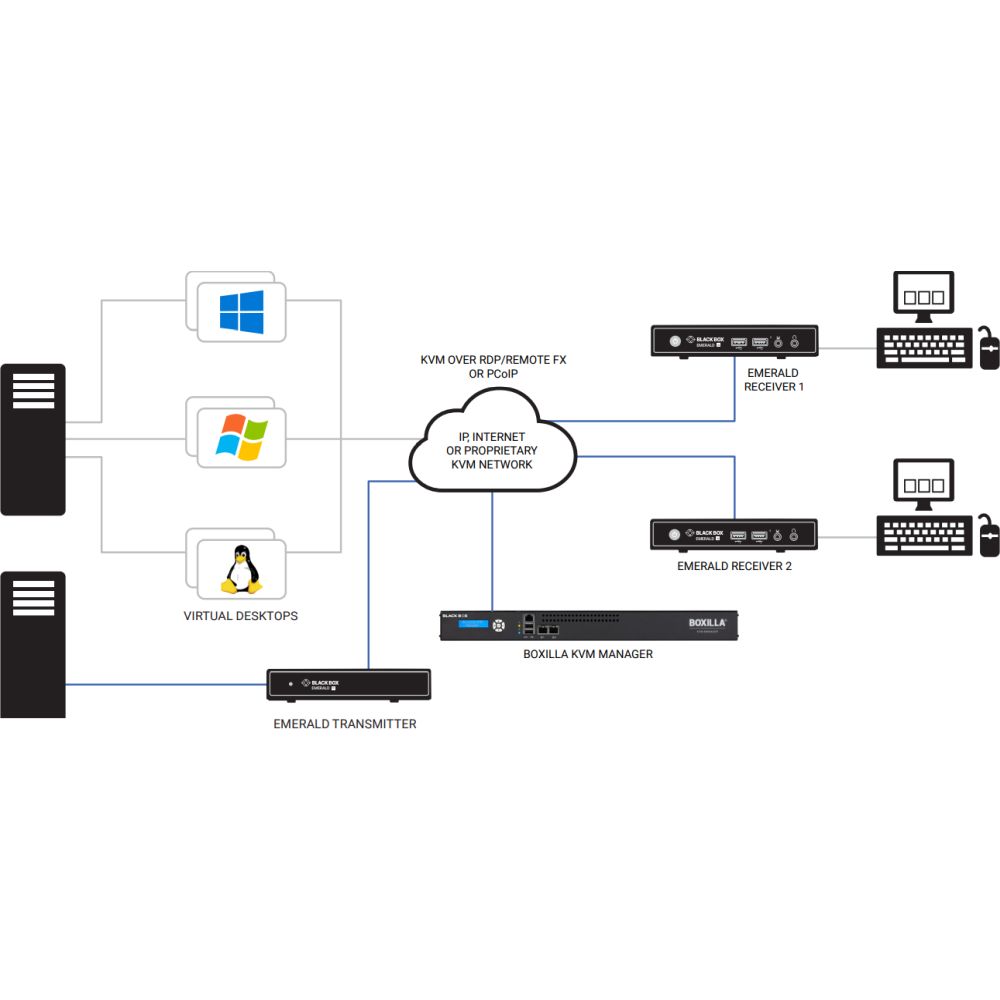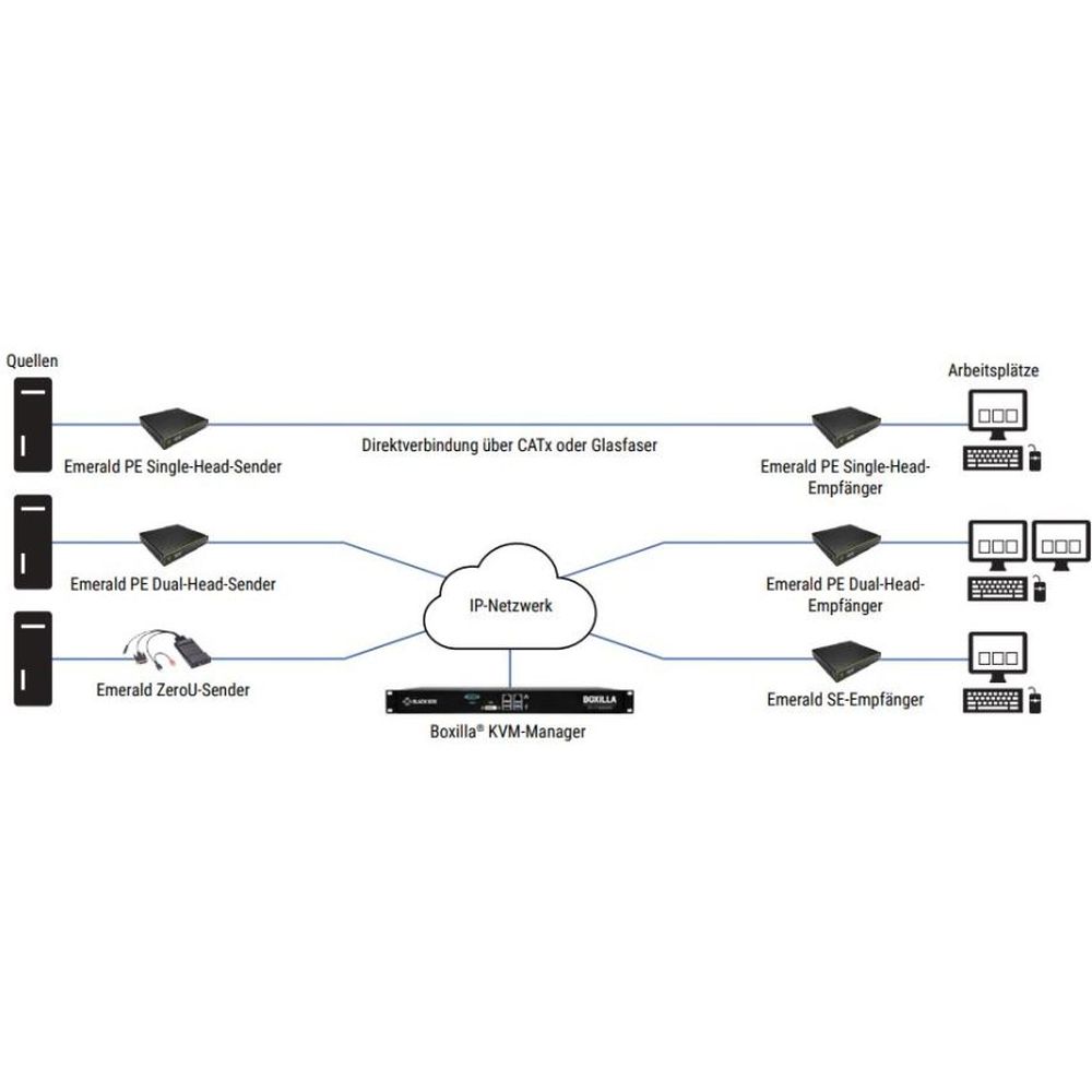 • Beide Geräte können ebenfalls mit anderen Emerald Transmitter oder Receivern kombiniert und gemeinsam mit einem Ethernet Switch in ein KVM Matrix System integriert werden. Wenn dies der Fall ist, wird meist auch die Boxilla Managementplattform genutzt, um die Verwaltung zu erleichtern.
