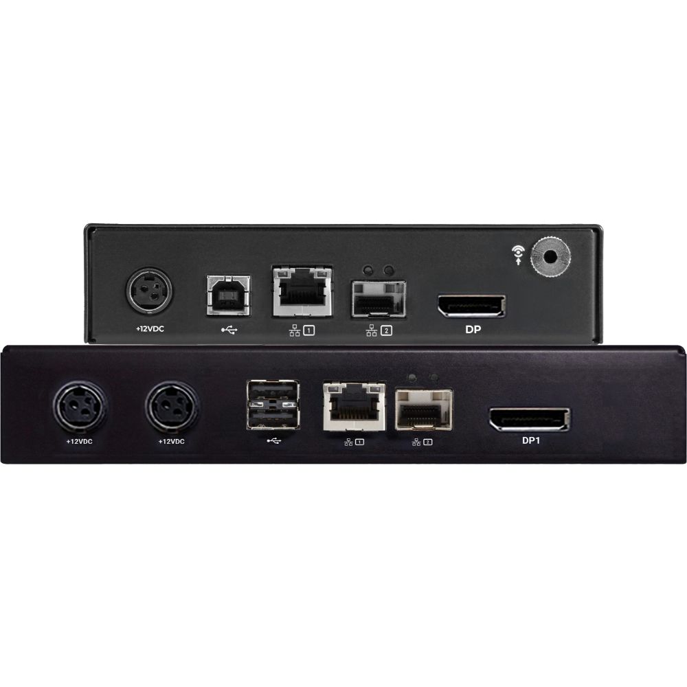 • EMD2000-PE-DP-R: Single-Head DisplayPort KVM over IP Receiver mit einem DP Videoausgang, 4x USB-A Ports, einer RJ45 Schnittstelle, einem SFP Port, 2x 12 VDC Stromeingängen, einer 3.5 mm Audiobuchse und einem Micro USB Konsolenanschluss