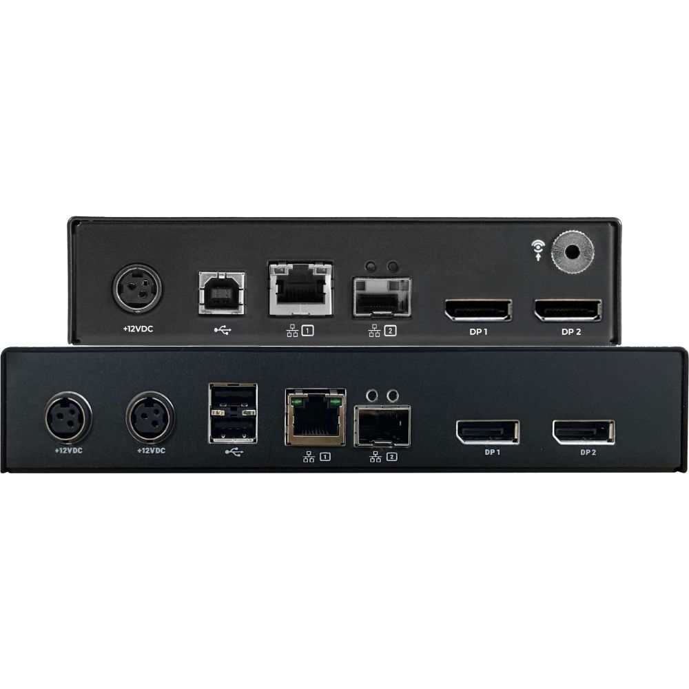 • EMD2002-PE-DP-R: Dual-Head DisplayPort KVM over IP Receiver mit 2x DP Videoausgängen, 4x USB Ports, einer RJ45 Schnittstelle, einem SFP Port, 2x 12 VDC Stromeingängen, einer 3.5 mm Audiobuchse und einem Micro USB Konsolenanschluss